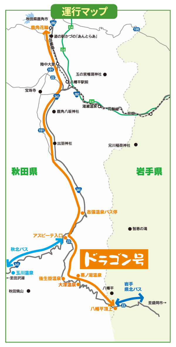 なお鹿角花輪駅から八幡平方面への移動につきましては、弊社「ドラゴン号」をご利用ください。